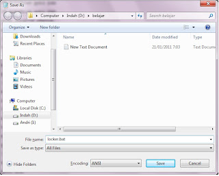 5. Beri nama text document itu dengan nama locker.bat. Caranya, pada text document pilih file, pilih save as, untuk file name diisi = locker.bat dan untuk save as type diganti all files, klik save.